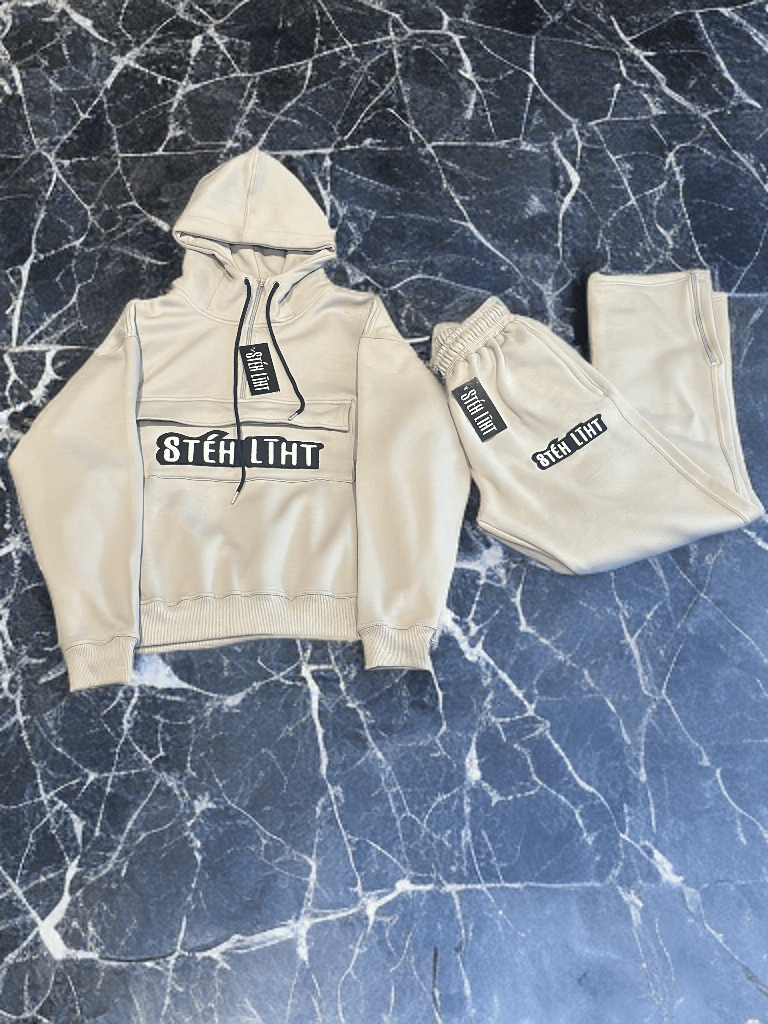 Grey sweatsuit with fastening straps and zippers on the side. Top has front pocket for storage, bottoms have two side zipper pockets as well as back pockets along with zipper opening bottom.